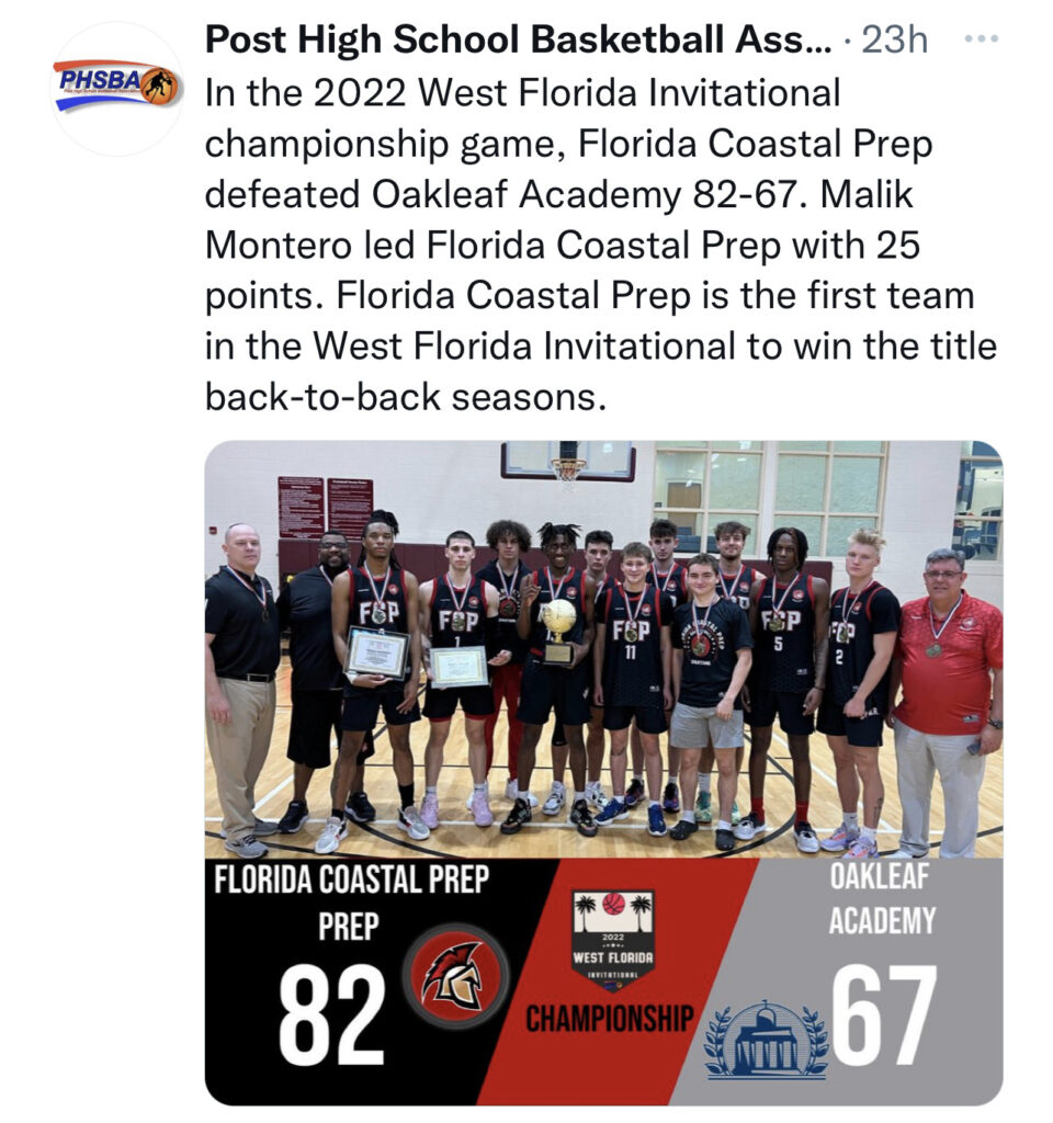 The Florida Coastal Prep Sports Academy basketball team has done it again! For the second consecutive year, they have claimed the title of West Florida Invitational Champions.